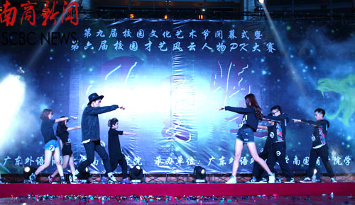 在晚会上,黎冬为在第九届广东省大中专学生科技学术节中获得“挑战杯”学术科技作品竞赛、广东省大学生翻译大赛日语笔译比赛获奖的同学颁奖。黎冬在致闭幕词中说,本届艺术节的主题是“享璀璨四方,耀多彩南国”,同时将世界文化融入到艺术中,让同学们近距离地接触了世界文化,感受世界文化的多彩多姿。本届艺术节的成功举办为同学们提供了一个施展才华的舞台,进一步丰富了我校学生的文化生活。