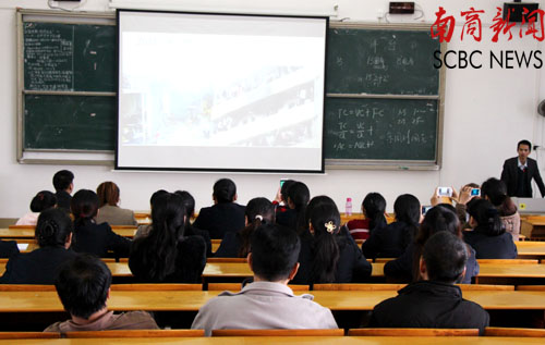 罗昆松重点讲解了防烟面具、灭火器及烟感器等消防工具的使用方法。他指出,在许多火灾事故中,大部分遇难者是被浓烟呛死,因此防烟面具在火灾中则显得尤为重要。为此,罗昆松亲身示范了防烟面具使用步骤及其使用时的一些注意事项。随后,他又讲解了灭火器的各种类型并且向大家示范了灭火器使用的“摇、拨、瞄、压、扫”五大步骤。