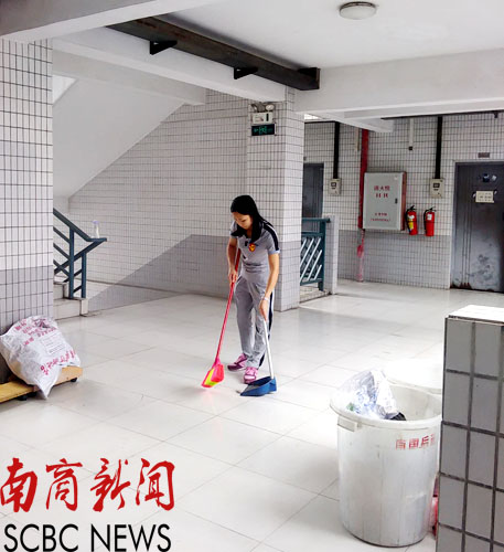 第七与第十小组成员在宿舍楼开展清扫工作。各小组成员带着清扫工具打扫卫生死角。其中一位成员表示此次志愿服务时间虽然短暂,但是对她的影响却很大。正是因为自己的亲身体验,她才明白清洁阿姨的工作的辛苦,为此,他们号召每个宿舍自己在门外制作一个传单箱便于放置宣传单,希望通过此举能够让阿姨减少弯腰捡传单的次数,让她们工作轻松一点。