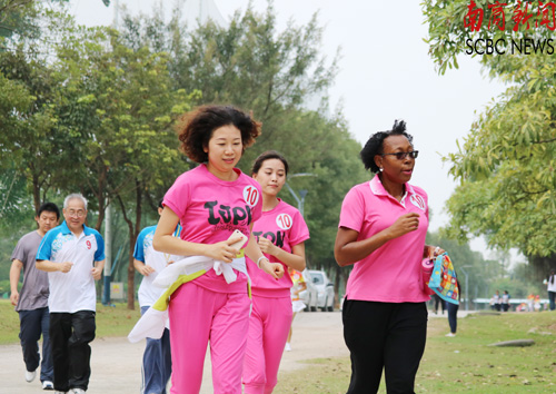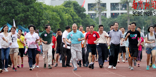 教职工环校跑在上午10时许拉开序幕,共有15个工会参加本次比赛。比赛从足球场跑道起点出发,途径北苑西路、南国大道、西苑南路等路线,最后回到跑道起点,总长度约2.4公里。学校党委书记黎冬,常务副校长袁长青,副校长杨永强、熊匡汉、王心洁等校领导带领机关工会最先起跑。