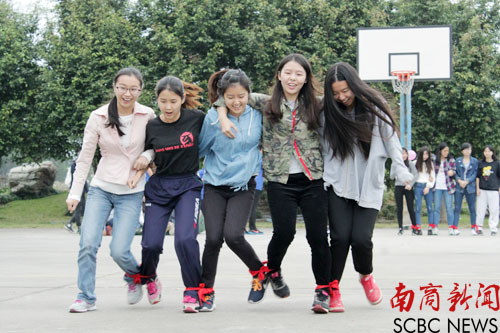 赛场上,5名队员的脚两两绑在一起,他们相互搭着肩膀,相互支撑,相互协调,全力以赴奔向终点。有的队伍齐声喊着“一二一二”的口号小跑着前进;有的队伍虽然因为队员摔倒而需要重新开始,但他们仍竭尽全力冲向终点。