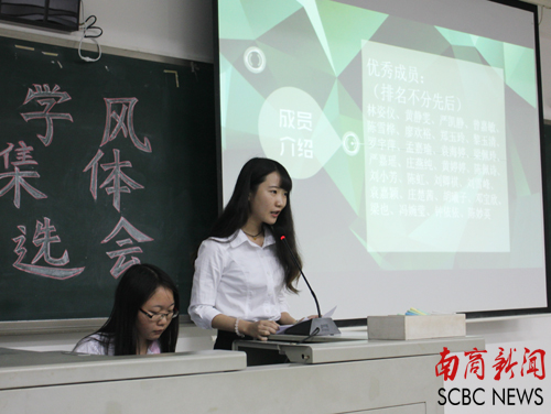 评选会上,26个候选班级代表依次上台进行班级风采展示。上台演讲的班级代表们用精心制作的幻灯片及富有创意的小视频介绍自己的班级风采。26个班级的展示方式丰富多彩,部分同学还自发地为所在班级拉横幅、喊口号,整齐响亮的声音将评比会的现场气氛推向了高潮。