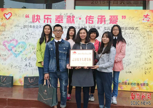 本网讯 近期,从2015年白云区志愿者项目推介和工作交流会暨“向日葵”社区陪护计划启动仪式上获悉,由我校青年志愿者行动指导中心驿站队、黄埔技工、慈善协会和广州涉外经济学院联合进驻的太和文化广场志愿驿站获“志愿服务先进集体”称号。我校陈昱津、李月、苏柏安、陈英东、钟永昌、幸诗敏、梁燕冰共7位同学被评为“2015年白云区优秀志愿者”。