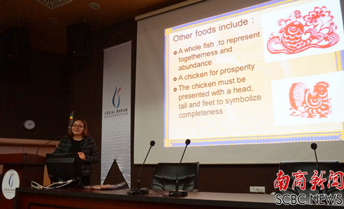 靑立花以“中国节日和风俗习惯”和“中国民俗艺术”为主题介绍中国文化。其中包括春节、元宵节、七夕等中国传统节日的风俗习惯和特色食品;中国的婚礼;中国的十二生肖;瓷器、剪纸、刺绣、扇子等民俗艺术等等,并用PPT展现了不同民俗艺术品的图片,让土耳其学生了解中国文化。讲座得到了现场同学的热烈回音,他们积极地向靑立花提问。