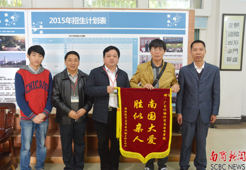 本网讯 12月14日上午,我校学生王琼英的父亲将一面印有“南国大爱、胜似亲人”的锦旗送到了学校。常务副校长赖志立代表学校接受了锦旗。