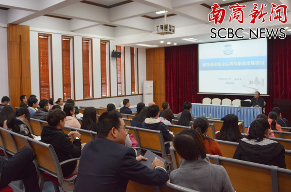 本网讯 2月29日,华南师范大学陈岸涛教授在教学楼F101举办讲座,他以“辅导员的职业认同与职业发展”为题传授如何成为最受欢迎的辅导员。全体学工人员聆听讲座。