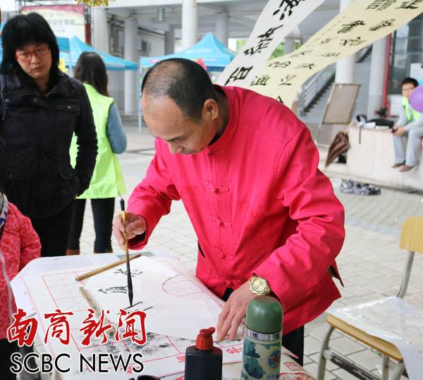 本次服务嘉年华以摆摊的形式进行,共有12个摊位,分为服务区和游戏区。游戏区设置了“有朋自猜拳来”、“心有灵犀”、“众里寻友千百度”、“快D入碗度”等趣味十足的小游戏。值得一提的是,本次活动特别邀请了广州书法家宋汉雄先生来到活动现场。宋汉雄现场挥毫泼墨,作品捐赠给学校进行义卖,善款悉数捐赠给竹料镇的一户残疾家庭。