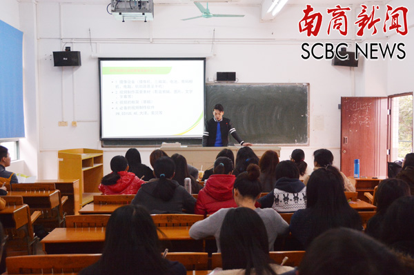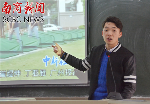 本网讯(记者 江萌萌) 3月12日上午,广东电视台摄像记者崔煜坤应邀来到“传媒训练营”,指导我校新闻爱好者制作视频新闻。