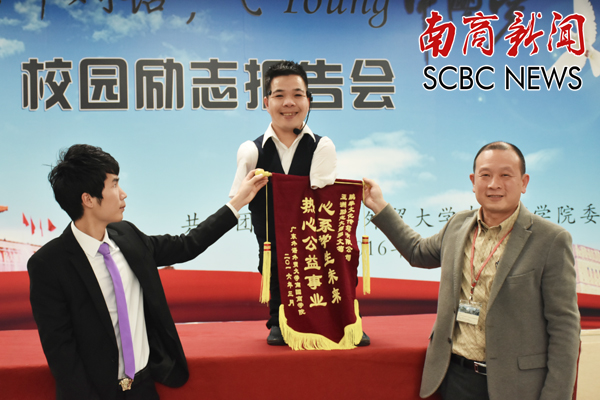 据了解,罗文苟天生没有双手,属高度残疾,曾找不到工作,睡过3个月的公园,喝了6个月的白稀饭,但他并没有放弃人生,而是努力奋斗,最后爱情事业双丰收。罗文苟本次来校做“与信仰对话,飞Young中国梦”公益演讲,用自身的故事告诉大学生不要轻言放弃。党委书记黎冬与青年学生一同聆听了讲座。