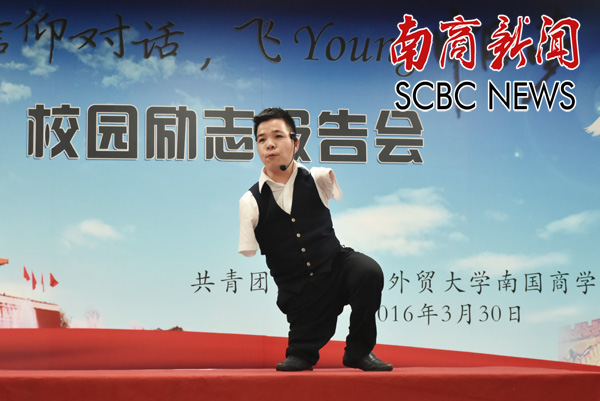 本网讯 (记者 陈重任)3月30日,一位特殊的演讲者站在了C201学术报告厅的演讲台上,他没有双手,左腿长右腿短,身高不到1米,他就是来自河源的罗文苟,2012年曾代表广东在英国伦敦世界残奥会闭幕式上做演讲。