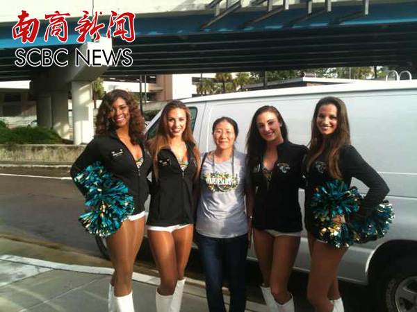 陈玉莲与美国橄榄球赛季的拉拉队队员合影