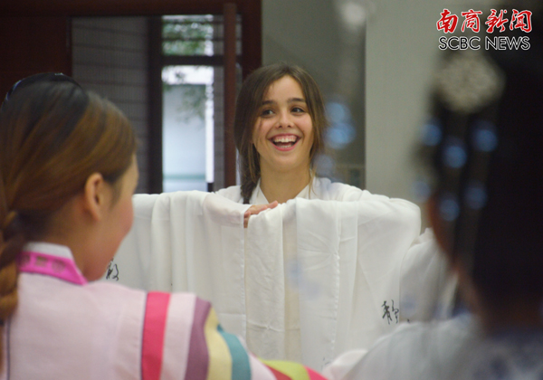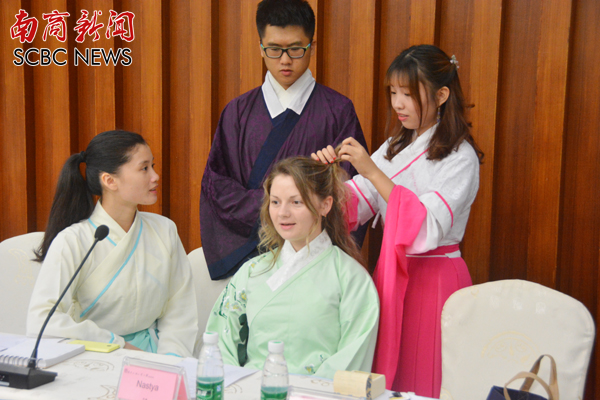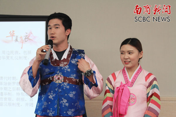 韩国留学生展示韩服与汉服的差异(廖思洁 摄)