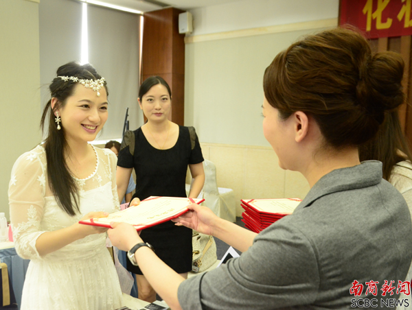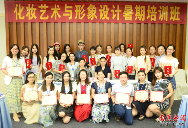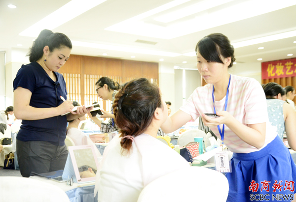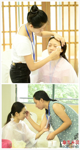 本网讯(记者 江萌萌)7月15日,C202多功能会议室气氛有点紧张,化妆艺术与形象设计暑期培训班在进行结业考核。学员们两两一组,根据培训期间所学的内容互相给对方化妆,由日本好莱坞大学院大学资深高级美容师宫本由美及其助理李艳根据日本化妆师的考核要求为学员打分并给予评语。通过考核,52名学员全部顺利结业。