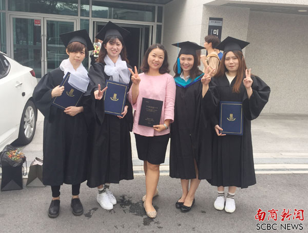 8月23日,东语学院副院长、朝鲜语系主任池圣女老师不远千里奔赴韩国,参加了3位学生在祥明大学的毕业典礼。“虽然我们的父母没有到场,但是‘池妈妈'的到来让我们感到无比温暖和感动。”看着手中的证书,回想起大学的青葱岁月,回忆起两年的留学时光,她们虽感艰辛,但却从未后悔。“作为第一届‘2+2’项目的学生,我们是幸运的,感谢学校领导和老师为我们创造的宝贵机会,也感谢自己双倍的付出收获了双倍的爱和经历!”(记者 张慧明)
