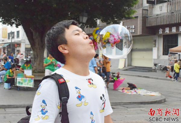 韩国留学生金保成在古香古色的街道上,追逐着空中飘扬的七彩泡泡,边跑边喊:“我要把这个泡泡吹起来!”
