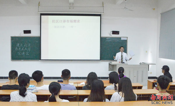 随后,西悉尼大学代表在我校教学楼G103举行宣讲会。Dr.Kenny Wang就西悉尼大学人文与传媒艺术学院的口笔译专业进行了介绍。据介绍,口笔译分为社区口译和社区笔译。社区口译采取“一对一”的方式进行口译活动,就业市场广阔;社区笔译则“能攻能守”,既能够从事书面翻译,也可以在视频、广告等媒体领域发挥作用。他认为,口笔译工作内容千变万化,能开阔视野,了解人生百态,是一份富有挑战性又有高额回报的工作。Dr.Stella Wu向学生介绍了西悉尼大学和商学院的基本情况。商学院主要专业有会计学和金融学,侧重于金融规划、税务以及应用金融(商业)等方面的知识。
