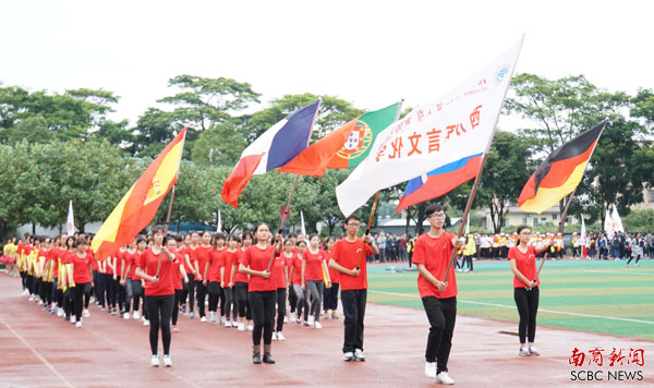 激情四溢的西班牙斗牛士,法国人的皇帝拿破仑,大航海时代的葡萄牙航海家,身着传统服装的俄罗斯女孩,手举啤酒杯的德国姑娘和小伙儿,西方语言文化学院方队通过舞蹈与短剧在主席台前一展欧洲多国文化风韵。走在队列中的外教与中国师生齐穿我校20周年校庆纪念衫,用西、法、葡、俄、德五国语言和汉语一起喊出该院运动会口号,充分展现出我校的多元化与国际化。