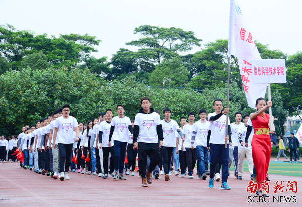 精彩的啦啦操表演结束后,国旗队成员、校旗方阵、裁判员方阵、各院系、各单位方阵依次入场。