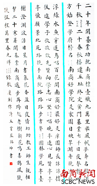 【编者按】“喜迎二十周年校庆”书画摄影比赛获奖名单日前揭晓。评审专家经过认真评选,从征集到的631幅作品中,评选出获奖作品19幅,其中一等奖1名,二等奖2名,三等奖4名,优秀奖12名。获奖书画摄影作品将于11月25日至12月2日期间在校内展出。下面就让我们先睹为快部分获奖作品吧!(书画作品摄影 林诗欣 许泽敏)