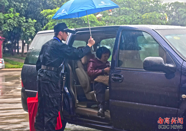 刘炜森在行政楼前为宾客打伞(陈阳 摄)