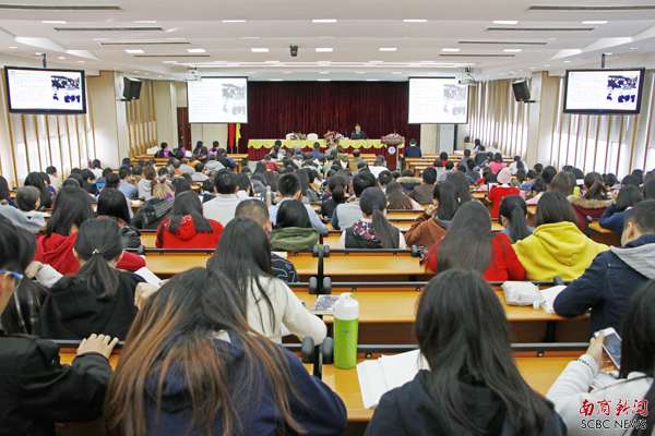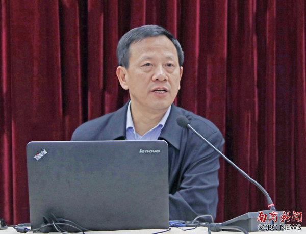 本网讯(实习记者 邵玺诺 林泽蔓 覃金兰 蔡冰)为贯彻落实党的十八届六中全会精神,深入推进“两学一做”学习教育,我校于12月15日下午召开十八届六中全会精神宣讲会暨“两学一做”专题讲座,华南师范大学马克思主义学院院长陈金龙教授受邀为我校全体党委委员、思政部全体老师、全体教工党员和部分学生党员代表做了题为《全面从严治党走进新时代——十八届六中全会精神解读》的讲座。党委书记黎冬主持本次讲座。