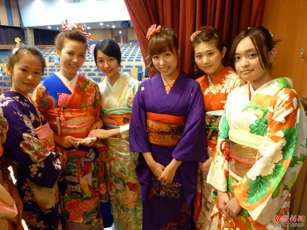 郑寅珑(右二)和同学们穿上和服感受日本服饰文化