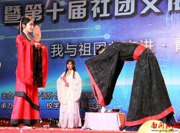 汉服协会带来的表演《鸾凤和鸣》惊艳四座,七位身着素纱的白衣少女,宛若仙女下凡。体态轻盈,手拿桃枝,伴随着悠扬的曲子翩翩起舞,散发少女气息,也让观众感受到了浓浓春意。他们还为观众生动形象地还原了汉代婚礼,“执子之手,与子偕老”的含义在他们的表演中渐渐呈现在观众的眼前。传统之美,便在他们的举手投足间慢慢流露着。