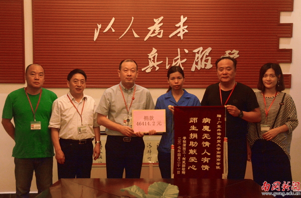 随后,黎冬代表学校将善款交到了何凤群手中,副校长杨永强代表学校接受何凤群赠送的“病魔无情人有情,师生捐助献爱心”锦旗。据统计,截止到发稿日期,本次募捐收到现金捐助46414.2元,通过“轻松筹”平台收到的捐助为59756元。从何凤群发出求助信息以来,不少师生不仅自己捐款,还利用新媒体通讯工具,呼吁身边朋友为其捐款。(刘阳)