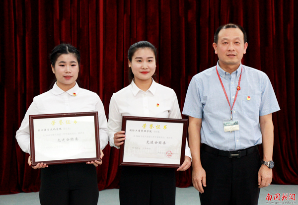 获得先进分团委表彰的东方语言文化学院团总支代表蔡丹丹以及先进个人代表张建丽在大会上分享了经验与获奖体会。