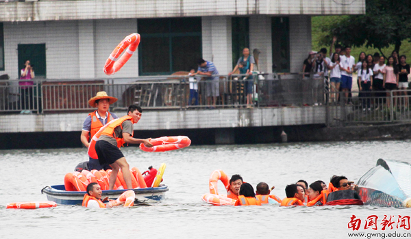 教工组决赛中出现了惊险一幕。当时,实力相差不大的三支参赛队伍即将完成半程较量,突然,公共课教学部与图书馆工会代表队的龙舟倾覆。全场观众惊叫声起的同时,两艘救生艇已经迅速赶到。事后,队伍中图书馆工会的老师回顾说,落水瞬间刚刚想到“怎么会落水”自己就已经被救援人员托住,一切及时得让人没有余地去想怎么办,更谈不上害怕。比赛全程在湖边巡视的保卫处黄桂森处长表示,历届龙舟赛都制定有救援应急预案,并且在赛前对救援队进行专业培训,保证做到对种种可能发生的险情“有备而来、应对自如”,比赛过程中救援艇始终跟随比赛船只,保证意外发生能及时施救。参与救援的一位保卫处不愿透露姓名的救生员说:“赛前我们都清楚地知道有哪些状况可能发生,发生了要如何行动,比赛过程中我们也是时刻绷紧了弦,所以船一翻,我们立刻行动,保证了有惊无险。”