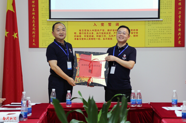 丁小军董事长接受南国创业校友联合会代表赠送的礼物
