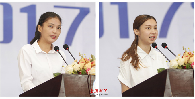 新生代表关乐言表示,面对新的起点,面对充满挑战而又丰富多彩的大学生活,要牢记使命,珍惜时间,刻苦学习,努力提高自身的专业素养和综合素质,力争将自己塑造为既有高尚的道德情操,专业的学术水平,又有一定的实践操作能力的合格人才。最后,她呼吁全体新生以往届精英为榜样,怀揣梦想,携手向成功迈进,传承“批判、创新、务实”的南国精神,踏上新的征程,收获硕果累累的人生。 (刘阳 陈汝佳)