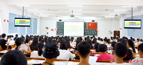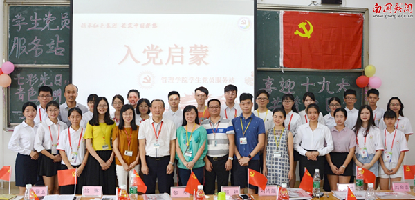 本网讯 近日,为迎接党的十九大召开,传承红色基因,共筑中国梦想,由管理学院党总支主办,学生党员服务站承办的七彩党日青色启明计划之新生入党启蒙教育会在教学楼C302举行,校党委书记、副校长黎冬出席活动,管理学院230名新生代表参加本次启蒙教育会。