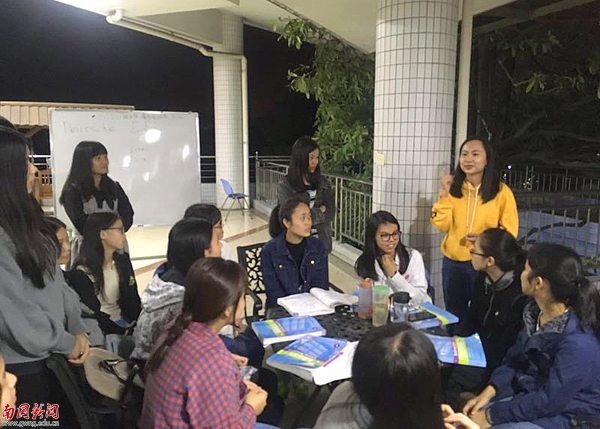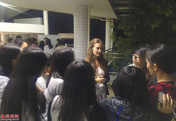 本网讯 10月16日晚,由西方语言文化学院举办的德语角在图书馆二楼休闲区拉开序幕。西语学院德语外教Katja与德语专业、非德语专业的学生展开了交流。