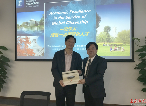 赖志立向宁波诺丁汉大学党委副书记、副校长沈伟其赠送纪念品