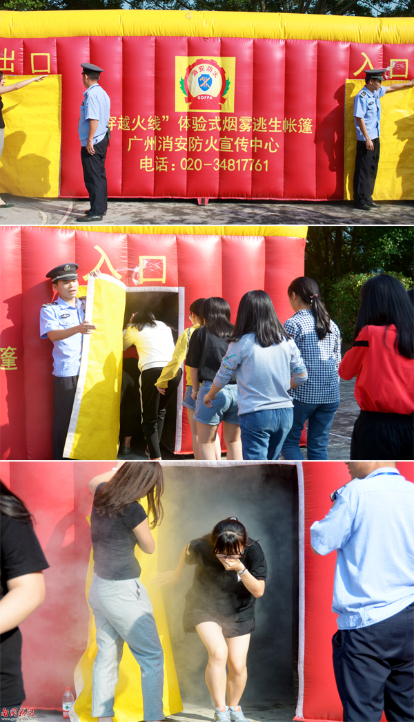 “手扶墙、弯腰、低身……”在教官的带领下,师生们尝试了“穿越火线”体验式烟雾逃生帐篷,亲身体验了火灾发生时的逃生方法。