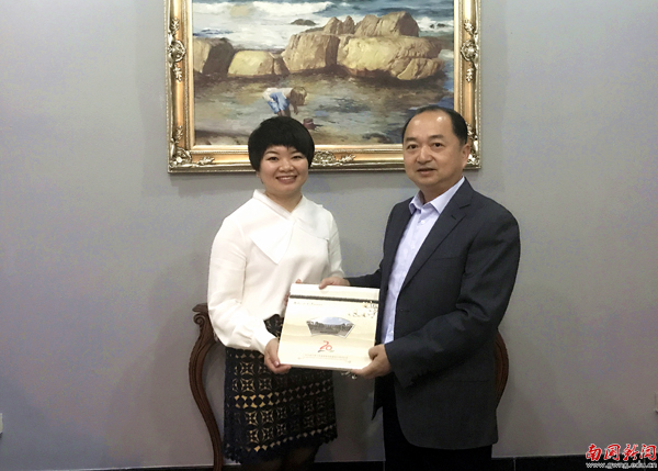 学校董事长丁小军向杨菊华赠送母校纪念品(翁琳 摄)