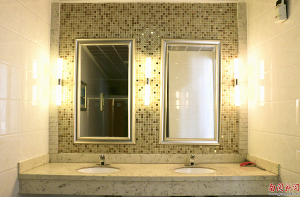 或许您很难想象,2年前,文化广场的厕所还没改造的时候,洗手间又脏又臭,隔间外仅有一个简易的洗手瓷盆,许多学生如厕后匆匆离去,留下一地的水渍,时常有学生在洗手间滑倒。现在,走进学校文化广场一楼的洗手间,空调和排气设备正在有序地运行着,亮堂的镜子前,一名女生正在整理妆容。