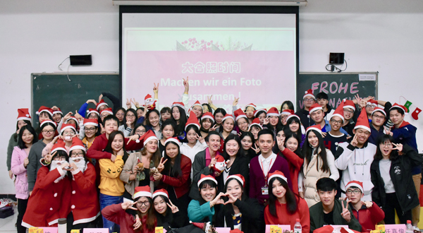 Melanie Moll带来了巴伐利亚特色的饼干与师生一道品尝,现场“你画我猜”“鸡同鸭讲”等小游戏更是把晚会推向高潮。我校外教积极带领学生互动,并一同合唱了德语圣诞歌。