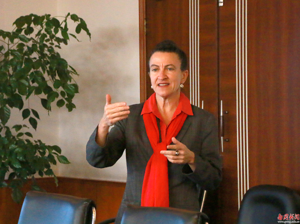 Melanie Moll对慕尼黑大学的情况做了详细介绍。慕尼黑大学是德国十一所“精英大学”之一,拥有190个专业,涵盖领域广,目前有7000多名外国留学生,中国学生的人数排名第二。为方便外国学生学习德语,该校在1952年建立了对外德语学院。鉴于慕尼黑大学完善的管理体系,学生能在较短时间内享受到高效、高质量的教育,在校期间所获ECTS(欧洲学分制)学分能被欧盟国家的大学认可。Melanie Moll强调,慕尼黑大学是负责德国高校外国申请者入学德语考试(DSH)的主办方,它不仅注重德语教学,还渴望与更多的国外高校合作,她希望慕尼黑大学与南国商学院的合作能长久、友好。