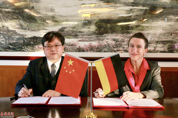 最后,双方签订合作框架协议,并就南国商学院德语专业学生前往慕尼黑大学留学等相关事宜进行了讨论和交流,互赠礼品并合影留念。