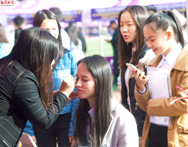现场的职业妆辅导站为学生指点面试妆容(陈迟 摄)