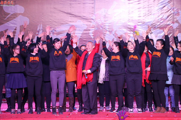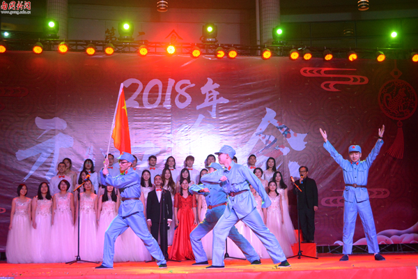 脚步移动,手夹快板,嘴念说词,动作一气呵成,快板声中弥漫着元旦的喜庆,画风一转,是公共教学部工会的老教授们庄严宣誓以及深情的告白,“春蚕到死丝方尽,蜡炬成灰泪始干,莫道吾侪桑榆晚,老马识途犹奋前!让,满天的晚霞更绚烂,让,生命的最后光华,绽放在,如诗如画的南国校园!”“圣诞老人”与“财神”在舞台中央,现场派发礼物,将现场的气氛再次点燃。