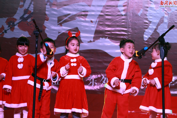 机关工会带来的《南国新时代》从含蓄内敛的古典舞到热情火辣拉丁舞,再到青春律动的鬼舞步,老师们的举手投足赚足了观众的眼球,值得一提的是,晚会还特别邀请一群身着圣诞经典红装的宝宝们为全场唱响“Merry Christmas”,稚嫩的童声瞬间“吸粉”,观众的心瞬间因这些可爱的宝宝们而变得柔软起来。