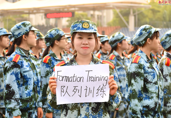 同学们表示,军训不仅锻炼了自己的意志力,而且收获了“战友”之间的友谊,在军训中使用英语专业术语,为军训增添了很多乐趣。 (英文学院 高彩云 华文婷 陈敏仪 图/魏珍妮)