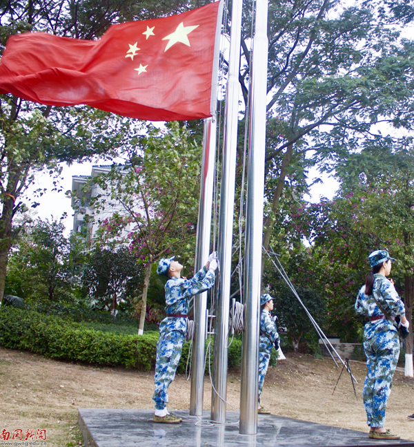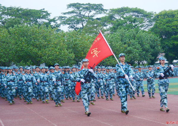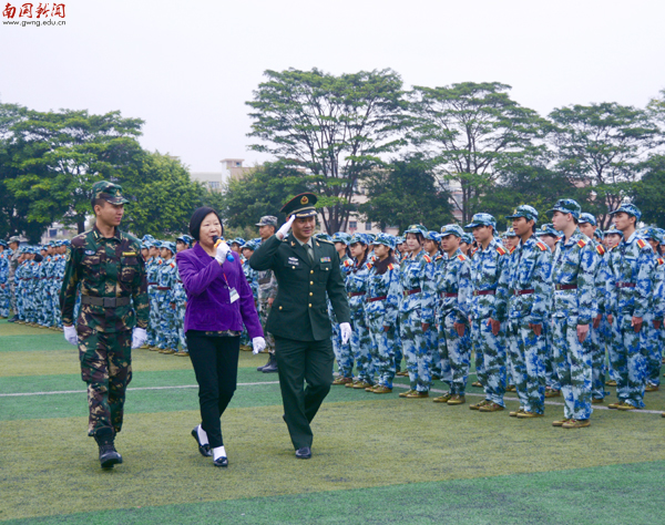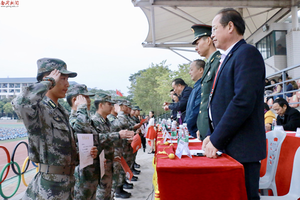 本网讯(记者 陈敏仪)1月5日上午,2017级新生军训阅兵暨总结表彰大会在学校田径运动场举行。副校长杨永强、熊匡汉、王心洁、杨励,广州市民兵预备役训练基地负责人等出席大会,大会由熊匡汉主持。