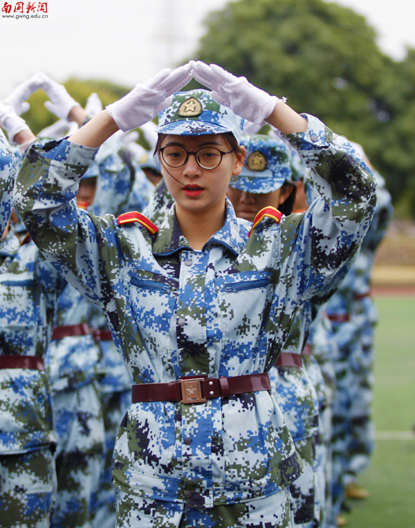 压轴表演是全体军训学生共同合作手语操《国家》,舞动着的白手套用无声的动作,为祖国献上最诚挚的祝福。