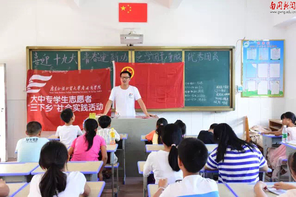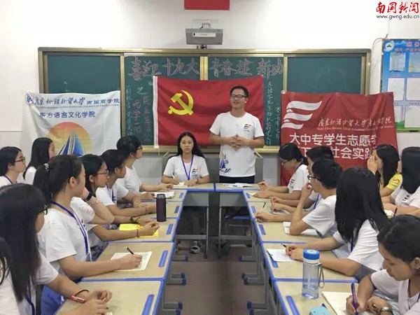 2017年暑假期间,我校组织184名学生共7支三下乡社会实践队伍分别赴清远、河源等地开展以“喜迎十九大,青春助新功”为主题的“三下乡”社会实践活动。在本次三下乡社会实践活动中,我校学生践行学校“通基础,精专业,强外语,重实践”的办学理念,将所学专业带入支教课堂中,并且结合本次三下乡活动的主题,立足于中国梦的学习基础上,为支教点的学生讲述“一带一路”倡议的积极意义,同时创新课堂形式,以课堂教学、科普宣传、社会调研、拜访老党员以及捐赠物资等内容开展实践活动。