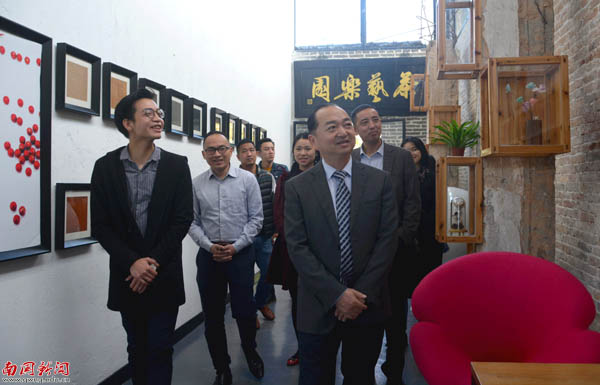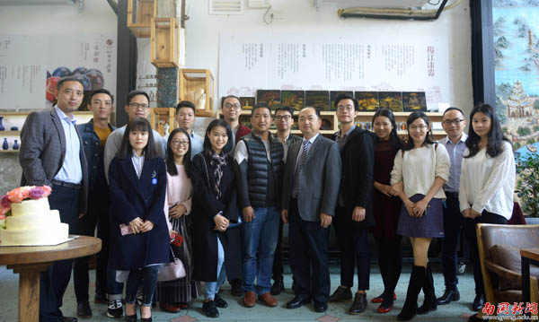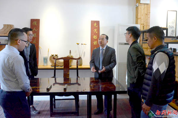 来到校友吴丹创办的与共会所,丁小军对其经营的产品和店面风格表示了肯定和赞赏。该会所传承发展阳江“三宝”之一的漆雕文化,把制作经营漆雕生活工艺品作为主攻方向,整合餐饮、读书等行业,为客人营造了一个可购、可学、可读、可品美食、可欣赏工艺的优美环境。丁小军参加后与在场的校友进行了座谈,就企业文化、企业精神和发展战略以及人才培养等问题与校友进行了交流。