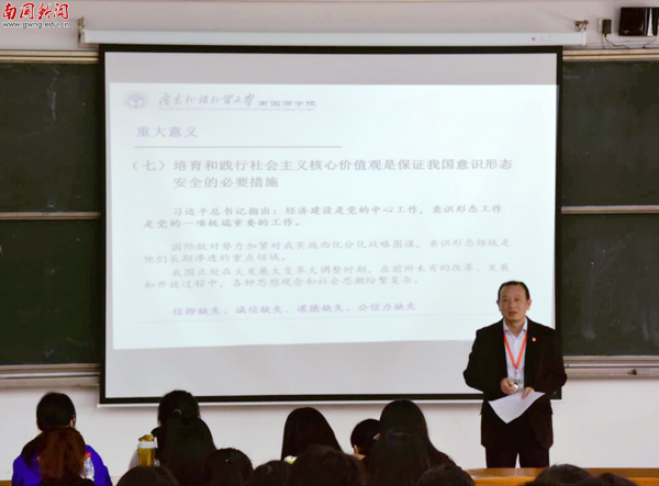 课上,黎冬既旁征博引了大量古今中外的名家名言,还立足当前广东发展面临的形势与机遇,结合“广东精神”和“南国精神”,让在场师生在历史与现实、个人与集体的纵横对话中深刻体会到践行社会主义核心价值观赋予我辈的神圣职责和特殊使命。